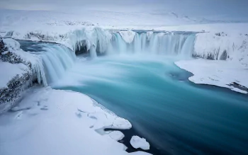 Frozen Serenity: Ice-Covered Lake and Majestic Waterfall