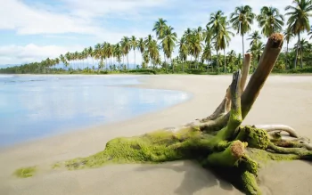 Mossy Driftwood Beneath Tropical Palms on a Quiet Beach